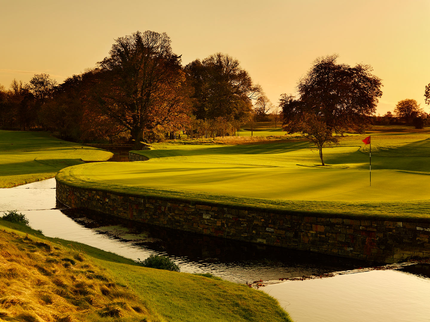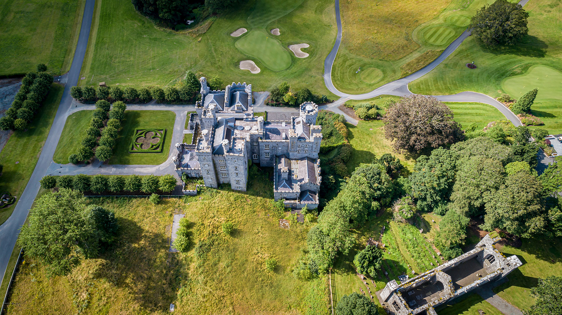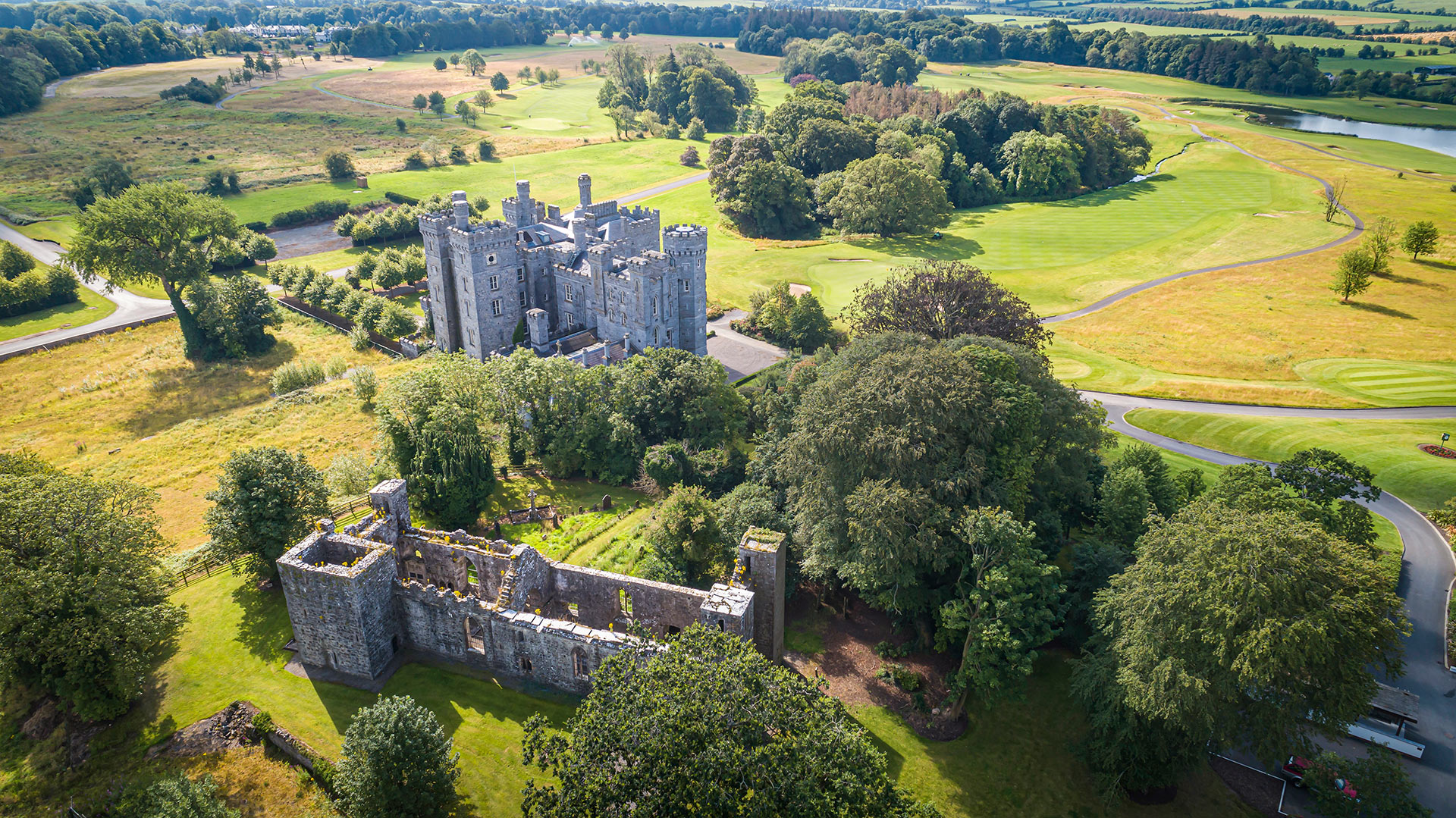 Today, the Killeen Castle Estate is home to an exclusive Jack Nicklaus Signature Design 18-hole golf course, which opened in 2009 and proudly hosted the Solheim Cup in 2011. Set across 350 acres, the beautifully maintained course is framed by clusters of ancient trees—including Ash, Oak, Sycamore, and Beech—offering a rich, natural backdrop. Keep an eye out for the distinctive Hawthorn tree at the 12th green, often referred to as the “magic tree.” With generous space between fairways, the surrounding woodlands are given room to flourish, enhancing the course’s unique character.