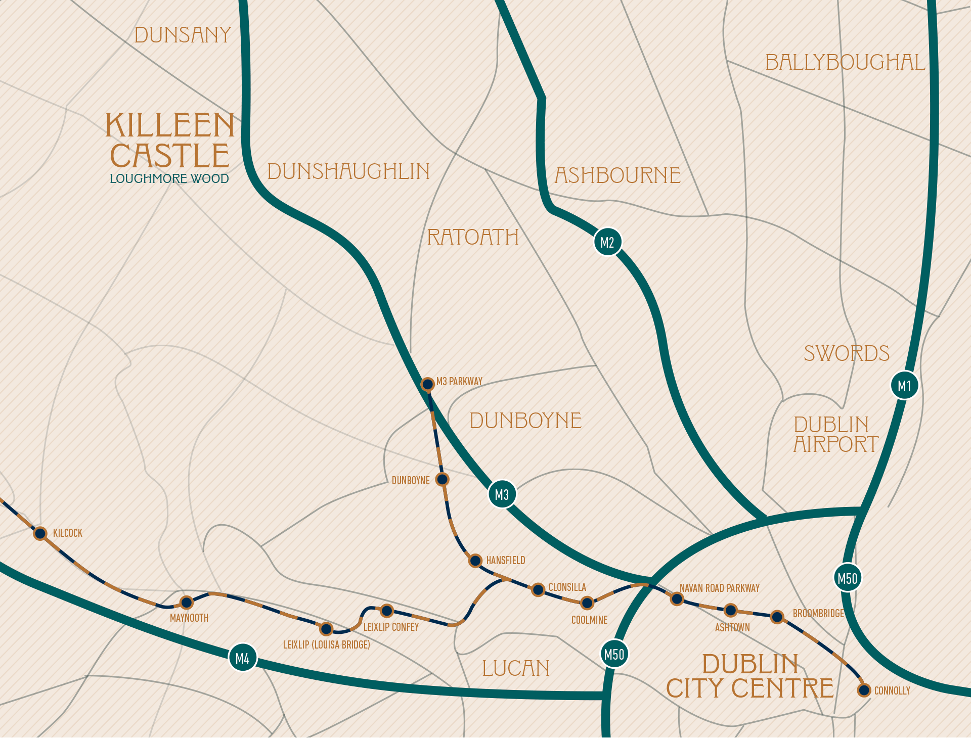 The M3 motorway is just a short drive from the estate, providing direct access to the M50 in approximately 15 minutes and reaching Dublin City Centre in under 45 minutes. For those who prefer public transport, a regular Bus Éireann service operates every 30 minutes, offering a convenient route into the city. Additionally, the nearby M3 Parkway rail station in Dunboyne provides a direct link to Connolly Station in Dublin, making commuting both easy and efficient.